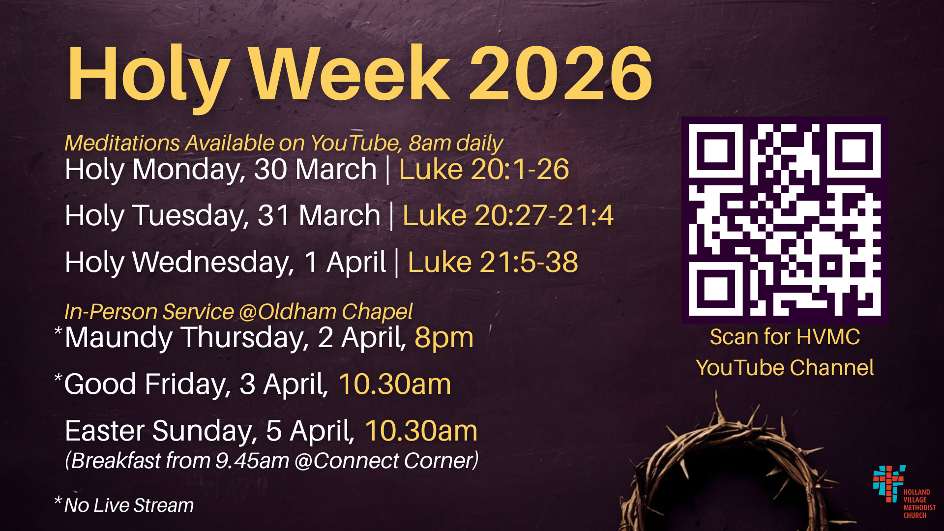 We have our in-person services on Maundy Thursday, Good Friday, and Easter Sunday. Do note that we will only live stream our Easter Sunday service.